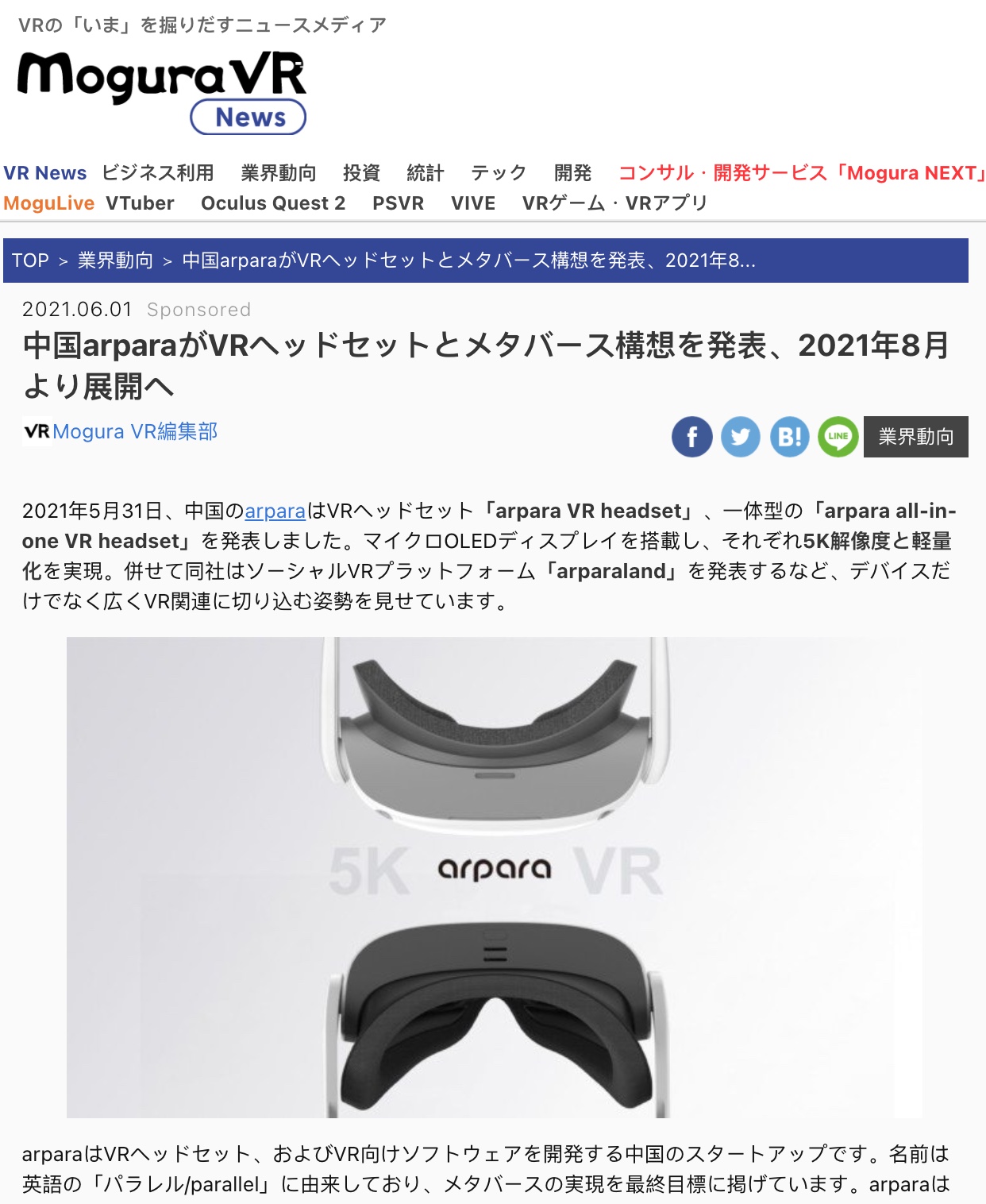 arpara VR产品凭借着优秀的硬件设备和参数表现,以及arparaland虚拟现实平台的构建成功吸引了海外科技媒体的关注,全球知名科技网站GIZMODO、VR 海外一线垂直媒体VRFocus、VRscout,还有Mogura vr、MIXED、Reddit等科技网站媒体,均表示对arpara VR产品的肯定。Youtube、Twitter平台也踊跃发布了arpara的相关产品信息。