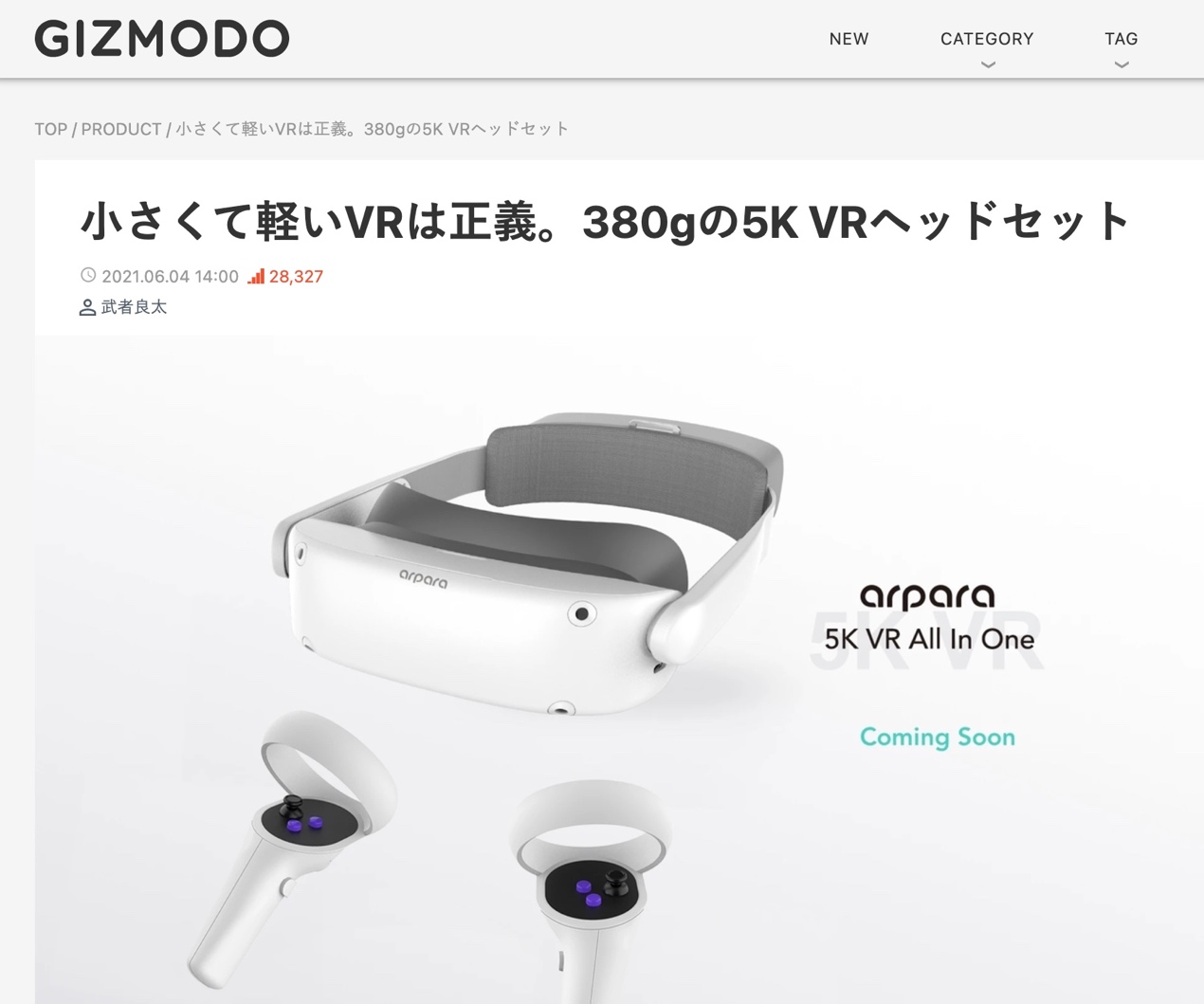 全球泛科技网站日文版GIZMODO则是被arpara VR轻小迷人的机身设计所吸引,arpara VR一体机主机重量仅有380g,相较Oculus Quest2 503g的重量在佩戴上会有明显差别。并表示对电池后置这一设计的肯定,VR头显常见的前重心设计已经被淘汰。